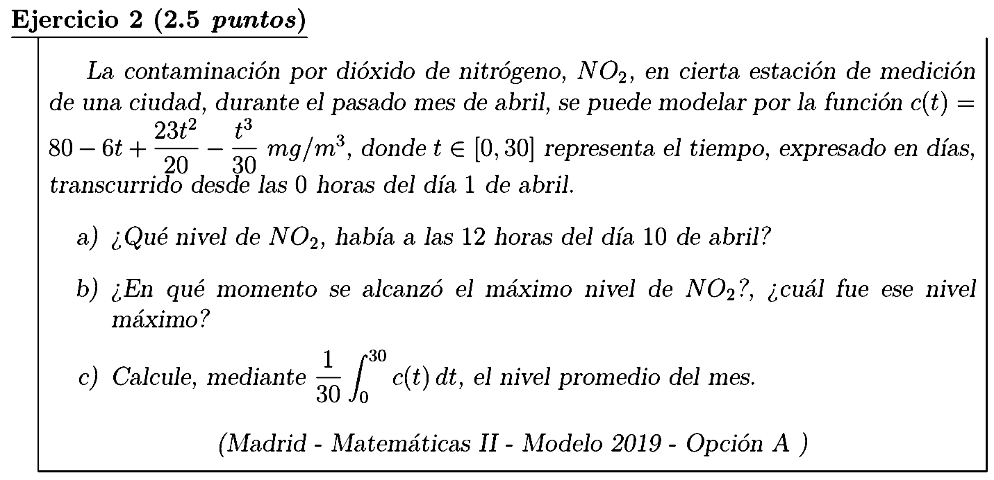 Este ejercicio es un ejercicio básicamente de optimización, en el que tendremos que calcular la máxima concentración de dióxido de nitrógeno en determinada zona de una ciudad.