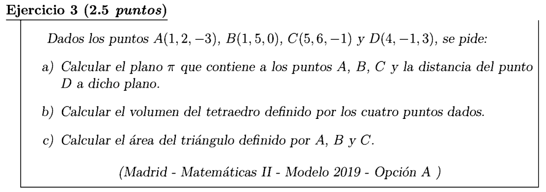 Este es un buen ejercicio para repasar las métricas. Te piden hallar el plano que pasa por tres puntos, calcular la distancia de un punto a un plano y hallar el volumen de un tetraedro y el área de un triángulo. Como ves un ejercicio completito.