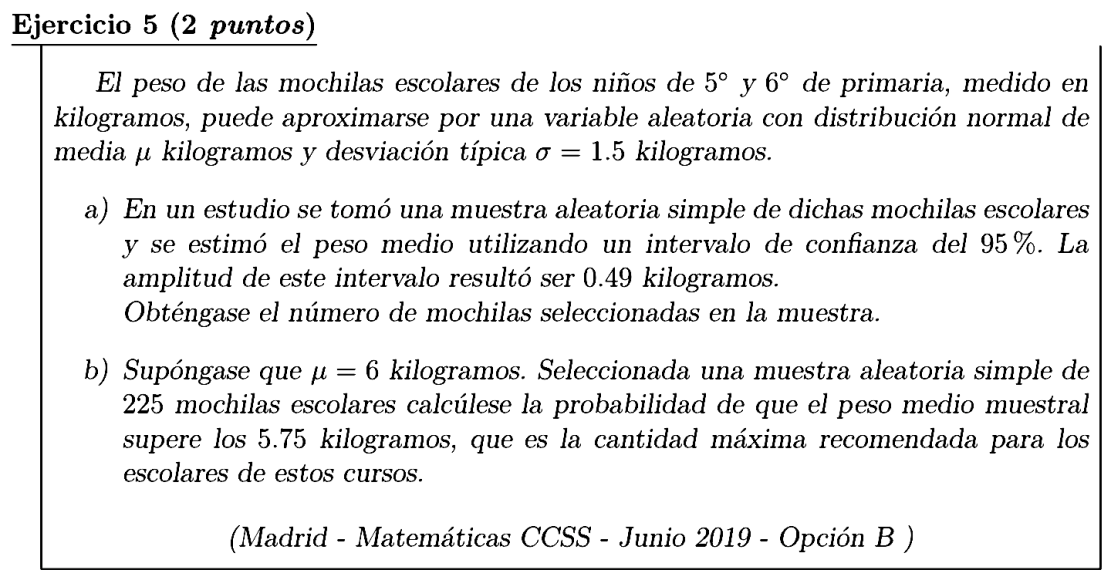 En este ejercicio del examen de la EVAU de junio de 2019 nos dan un intervalo de confianza y piden calcular el número de elementos de la muestra con la que se ha construido. Piden además la probabilidad de que la media muestral supere un determinado valor. Estos ejercicios no son dificiles pero tienen detalles que debes dominar.