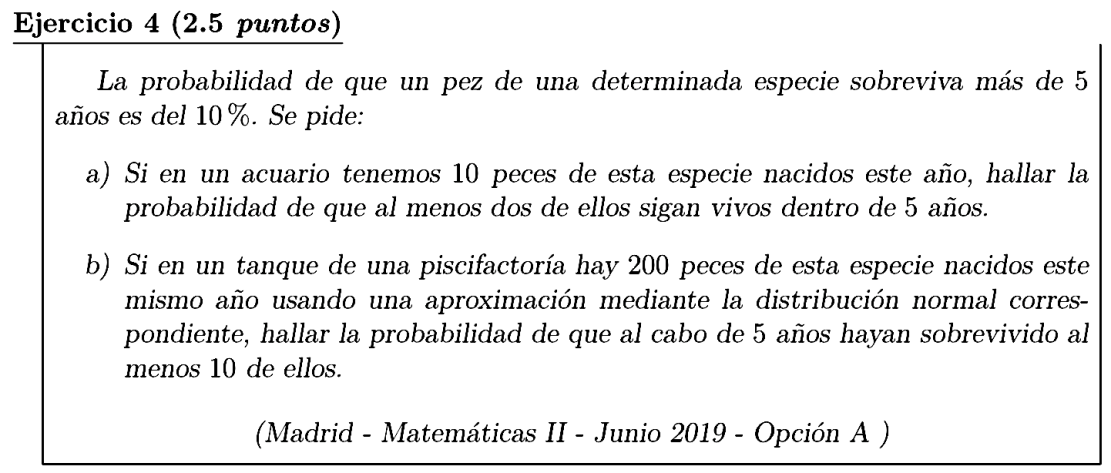 En este ejercicio del examen de la EVAU de Junio de 2019 nos «sorprenden» con la probabilidad de una variable binomial. En el segundo apartado podrás utilizar la aproximación de Yates para calcular otra probabilidad pero esta vez de una normal.