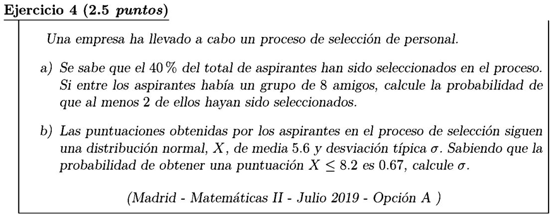 En este ejercicio del examen extraordinario de la EVAU de julio de 2019 nos dan una variable binomial de la que nos piden calcular una probabilidad y, en el segundo apartado, nos dan una variable normal de la que nos piden que calculemos la desviación típica, conocido el valor de una probabilidad.