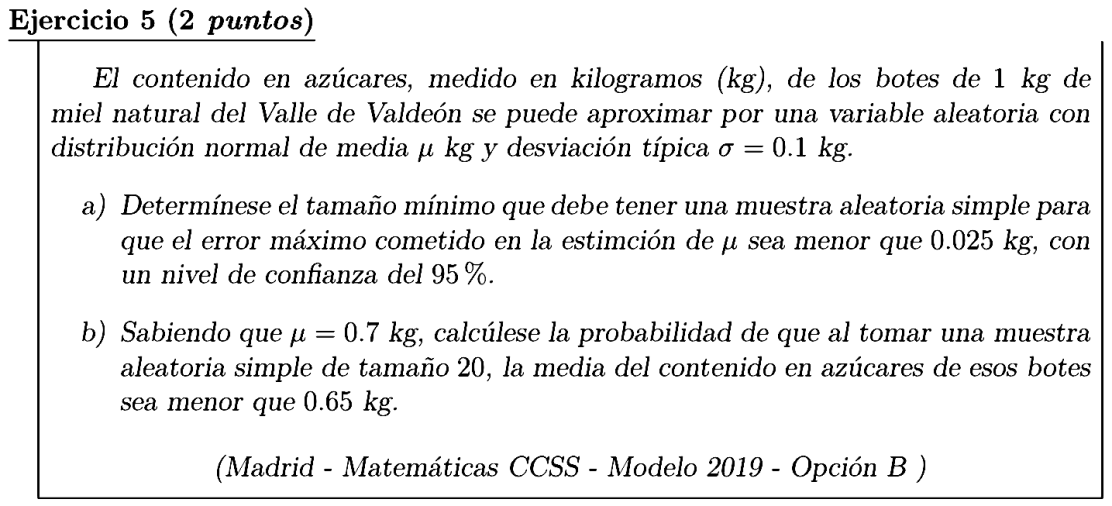 En este ejercicio del modelo de la EVAU de 2019 nos piden un tamaño muestral mínimo y la probabilidad de que la media muestral sea menor que un determinado valor.